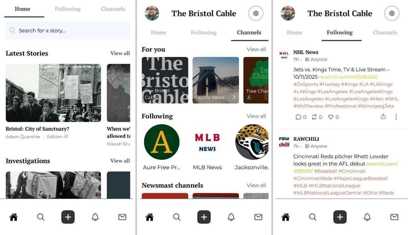 Newsmast Foundation helped The Bristol Cable members connect local conversations to global communities via an app. Screenshots: The Bristol Cable